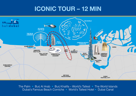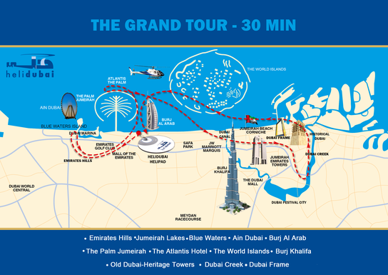 Burj Al Arab • The World Islands • The Palm Jumeirah • Atlantis The Palm Hotel • Burj Khalifa • Dubai Canal • Dubai Creek • Old Dubai • Dubai Creek Golf Course • Jumeirah Coastline